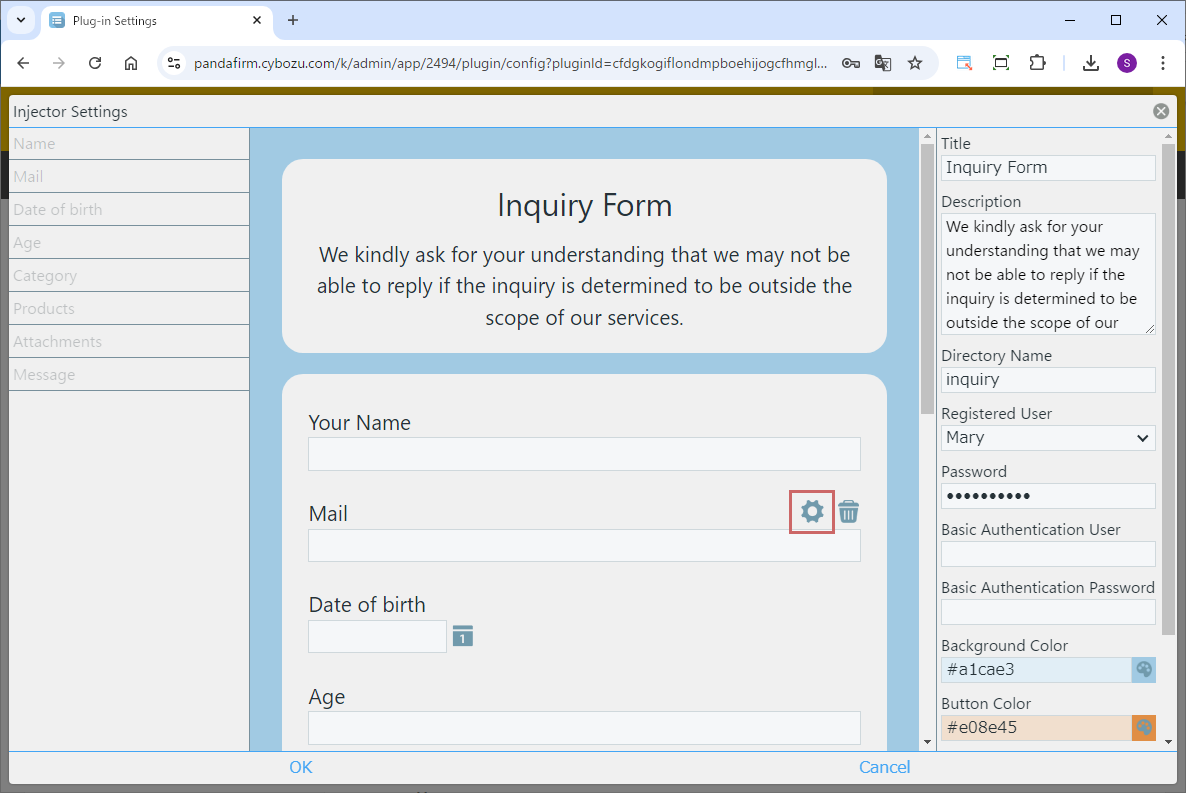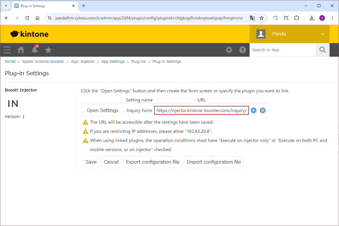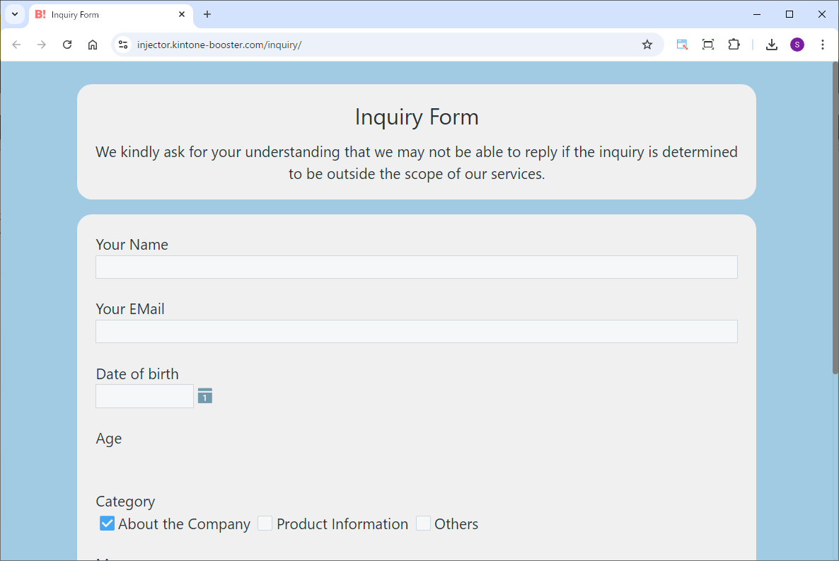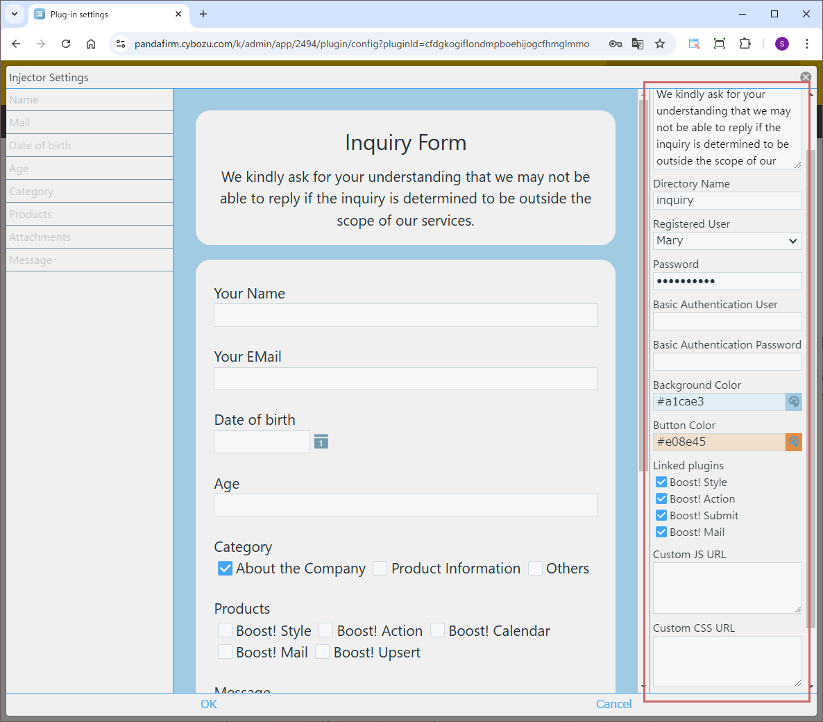 If you enter "injector" as the directory name, the URL of the Web form will be "https://injector.kintone-booster.com/injector/". You can only enter half-width numbers, lowercase letters (a-z), and symbols such as hyphens (-) and underscores (_). |
