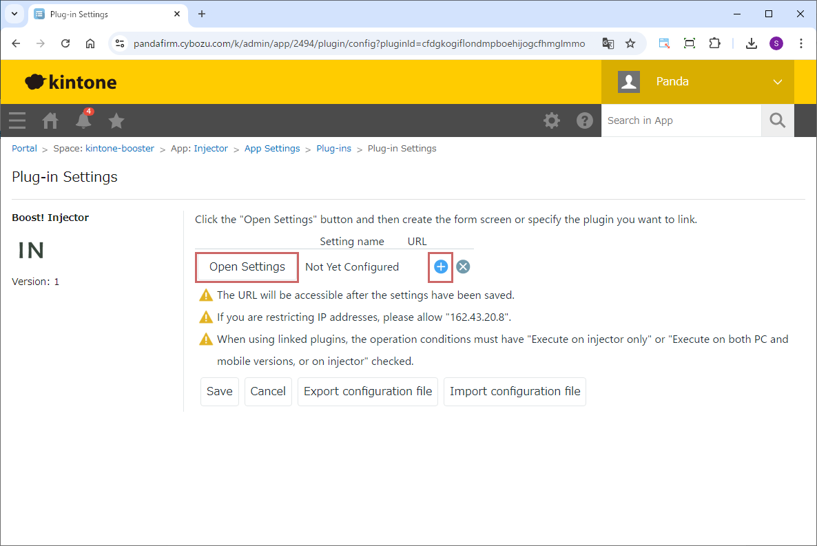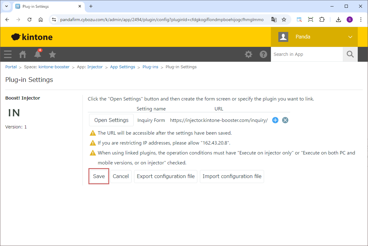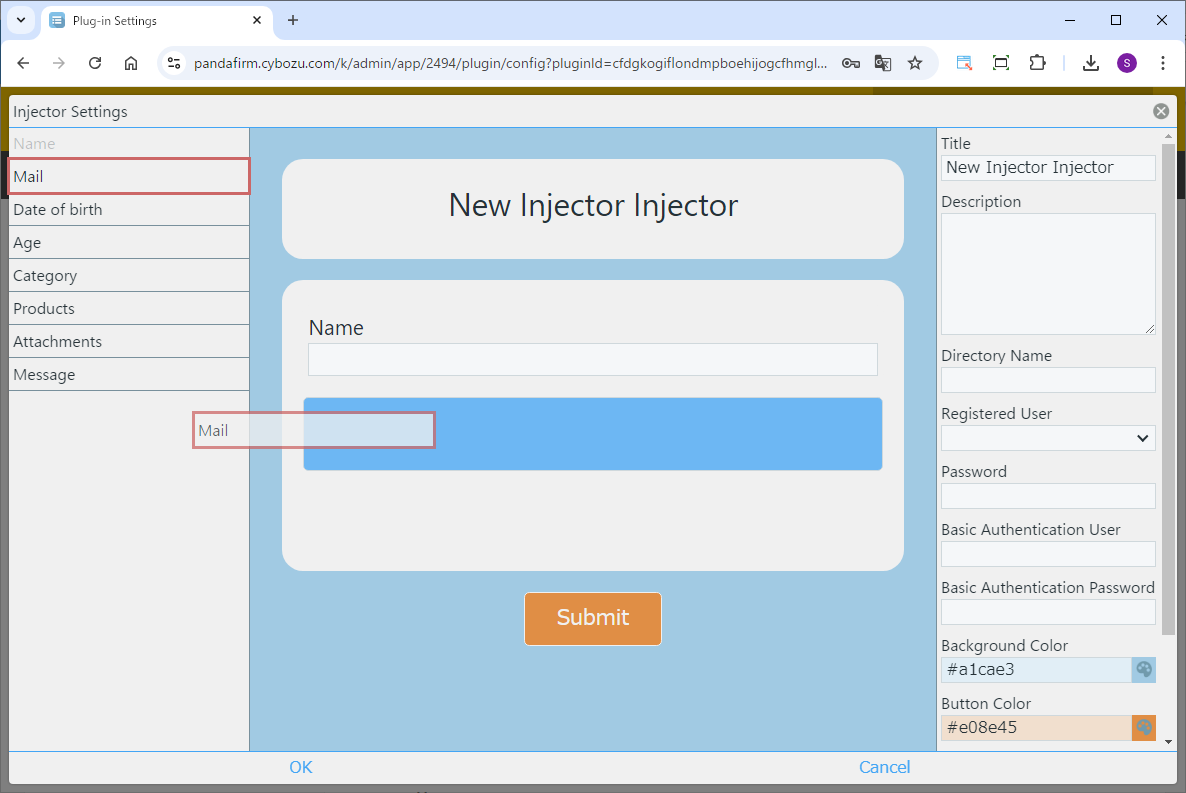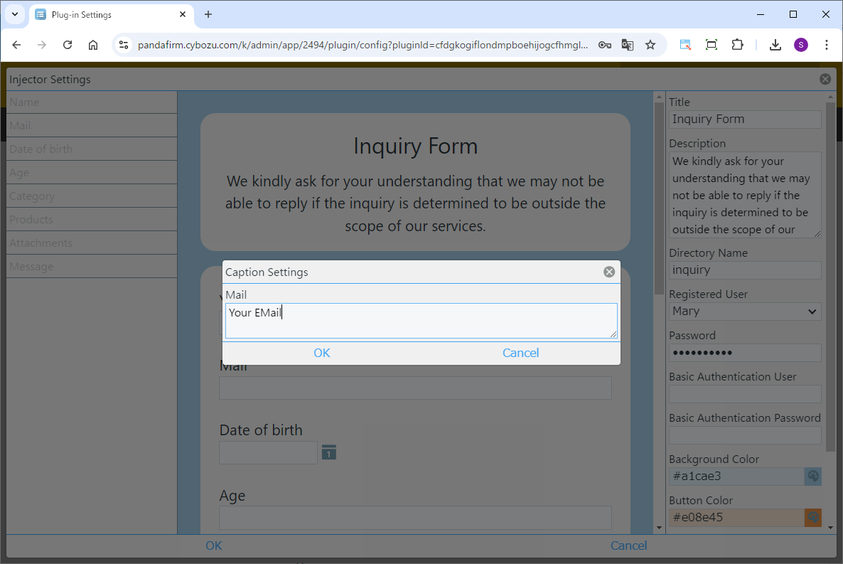 If you enter "injector" as the directory name, the URL of the Web form will be "https://injector.kintone-booster.com/injector/". You can only enter half-width numbers, lowercase letters (a-z), and symbols such as hyphens (-) and underscores (_). |