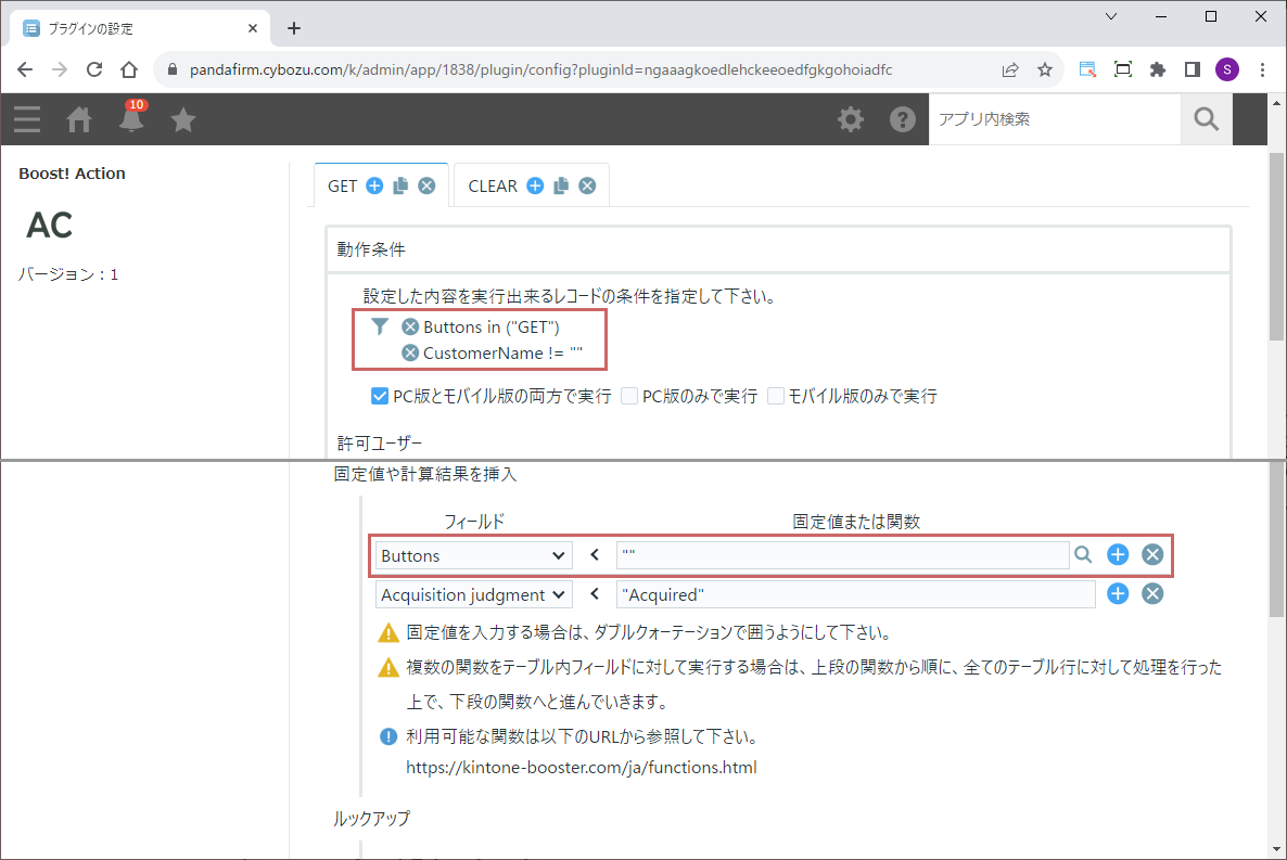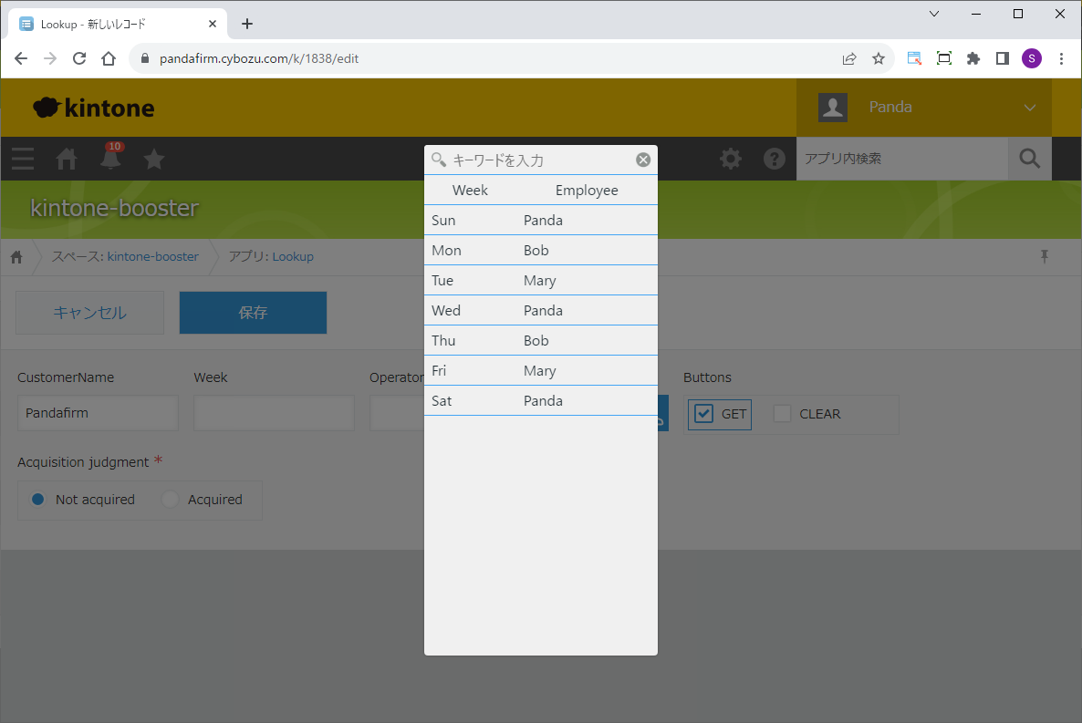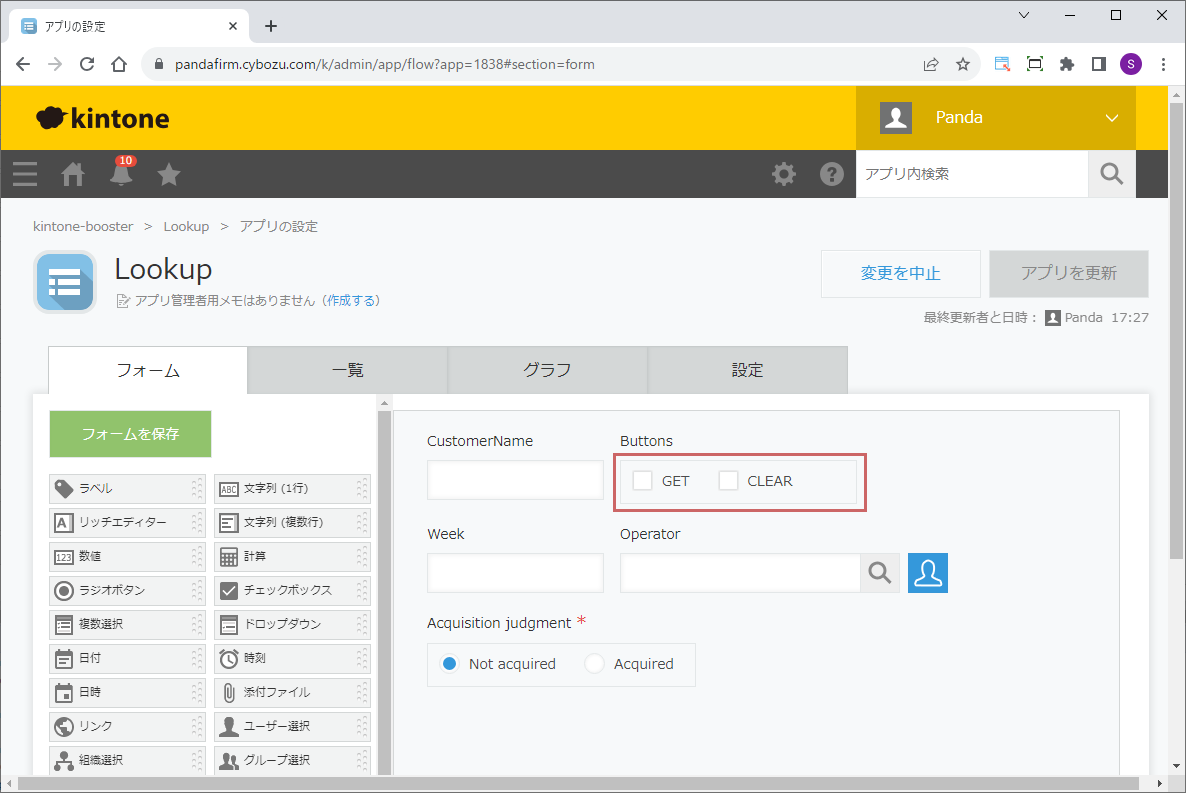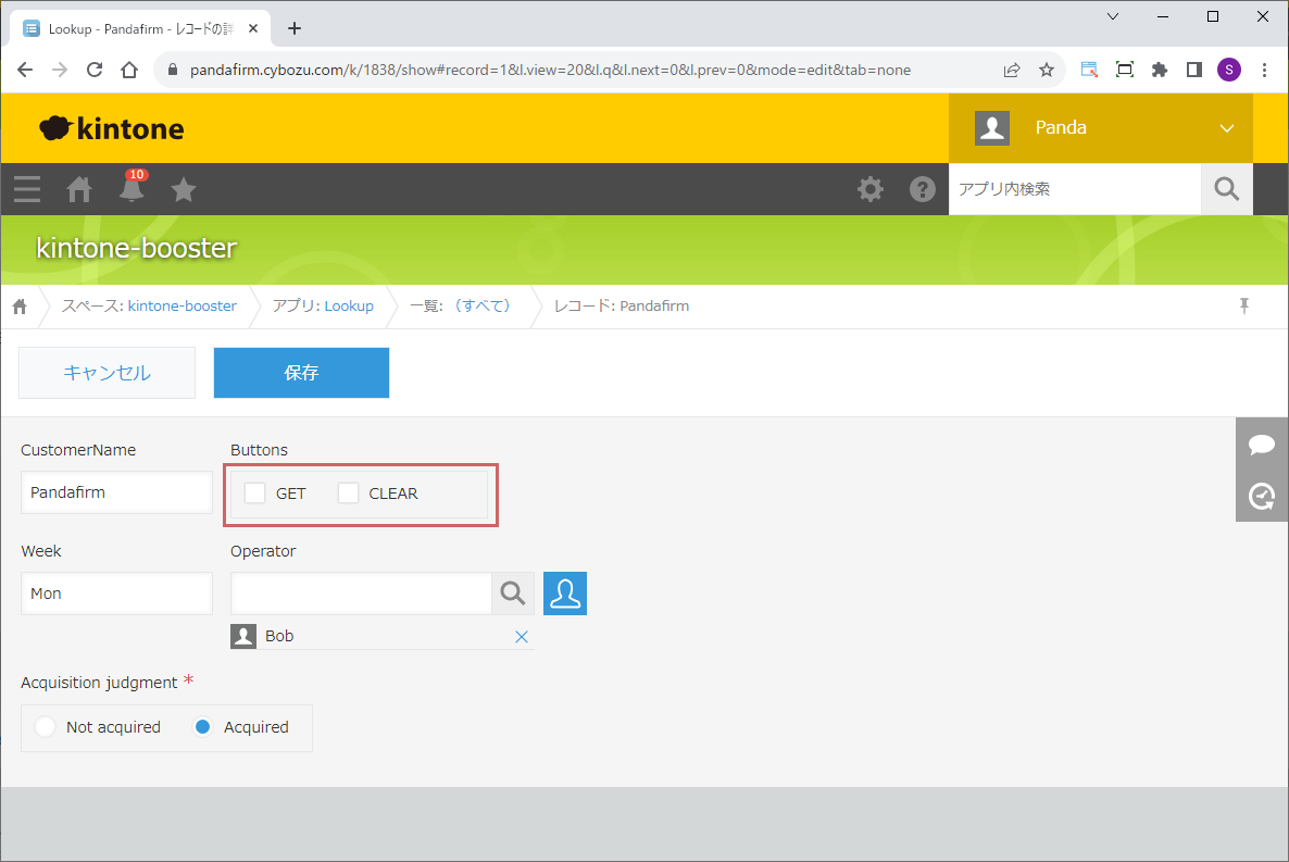 ルックアップフィールドと同様に取得とクリアボタンを配置する事も出来ます。