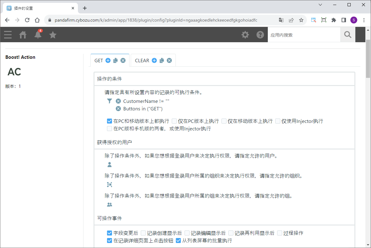 首先,指定可以执行该设定处理的记录的状态和登录用户的属性,然后,也指定执行该设定处理的事件。